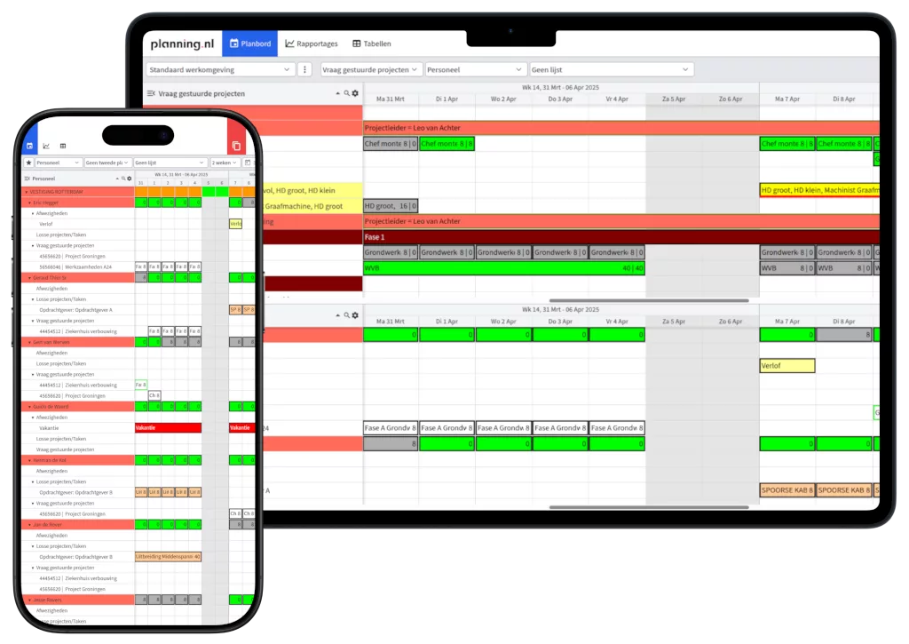 Planning.nl offers a complete planning tool that allows you to combine project planning and resource planning on a single planning board. We develop our software ourselves, and it runs on our own hardware from data centres in the Netherlands.